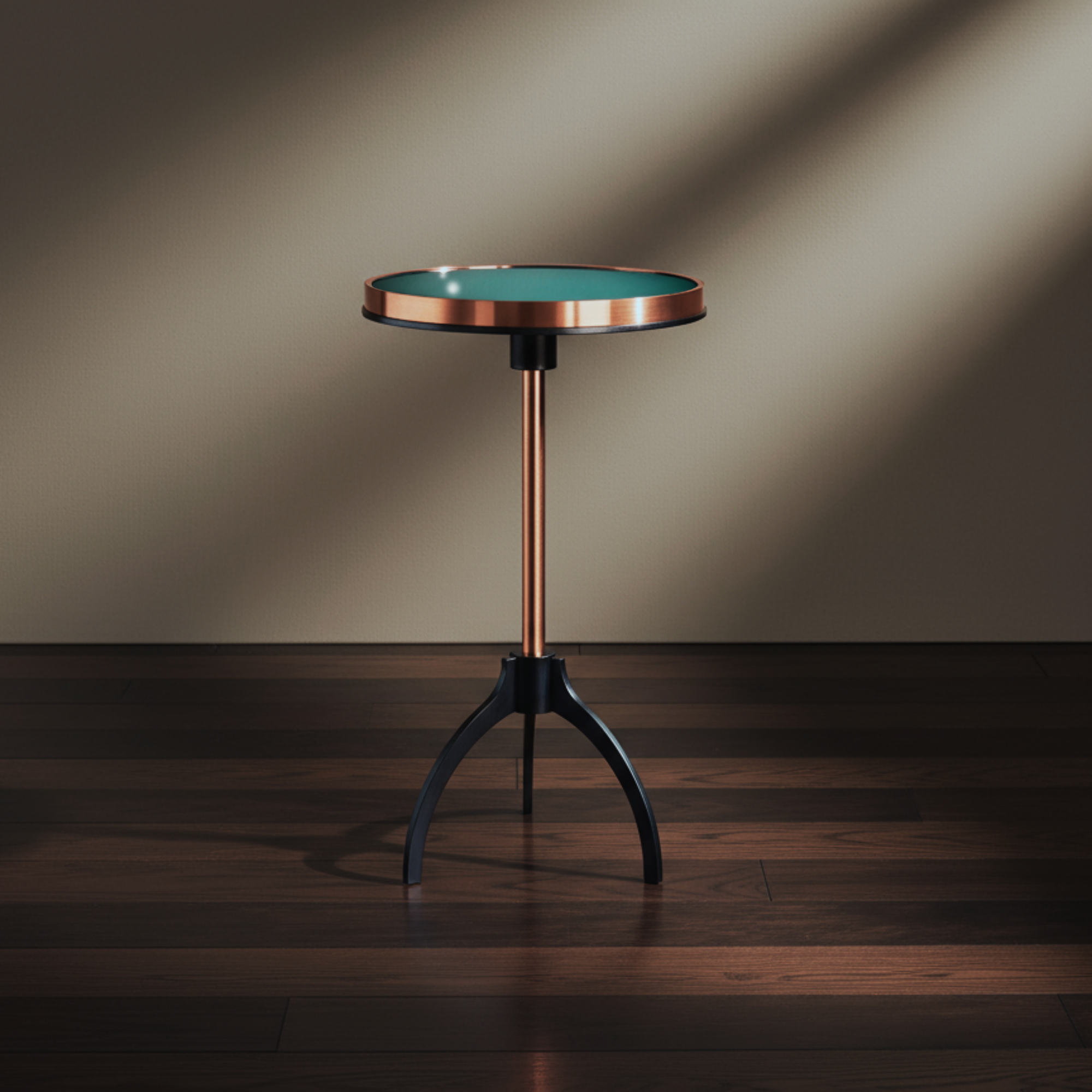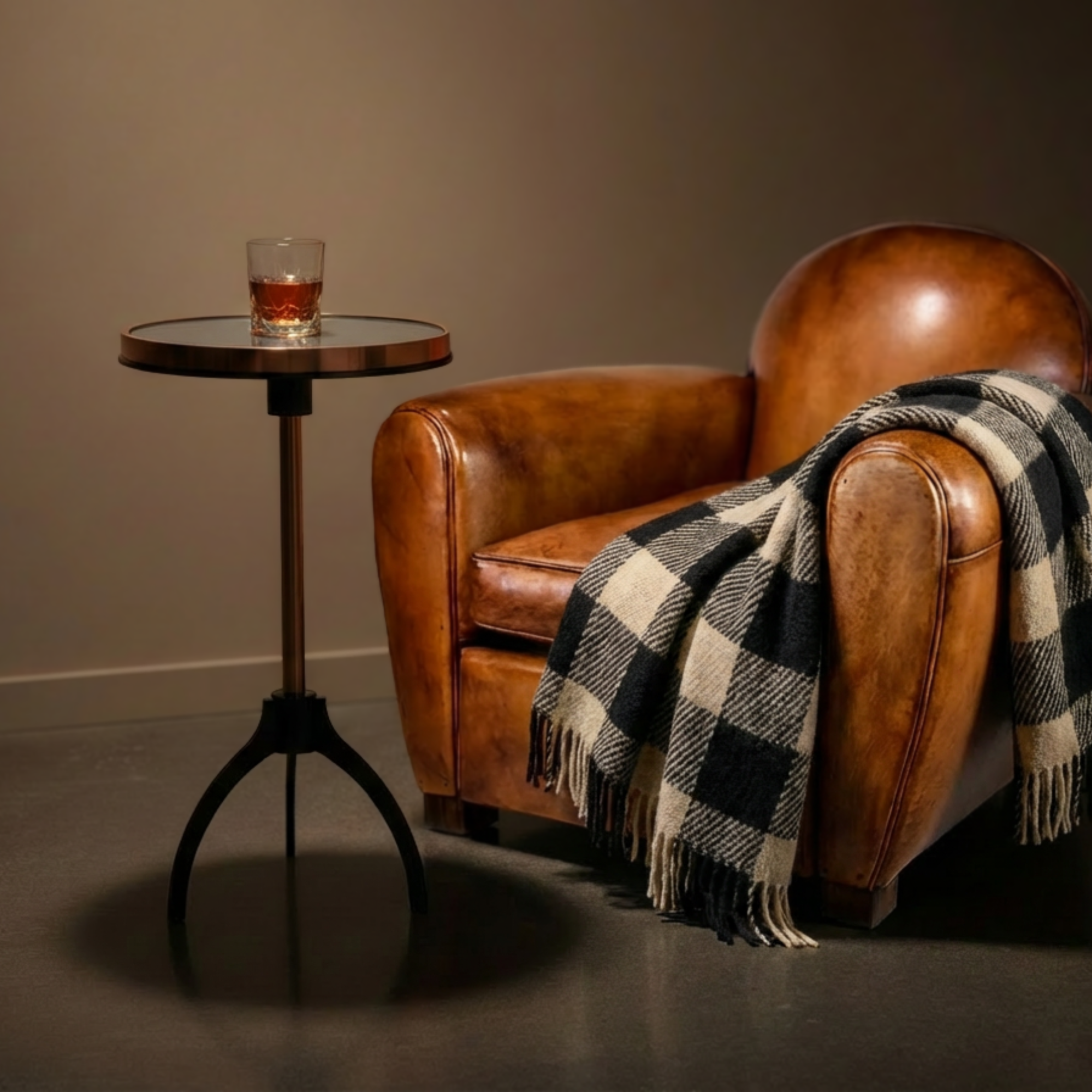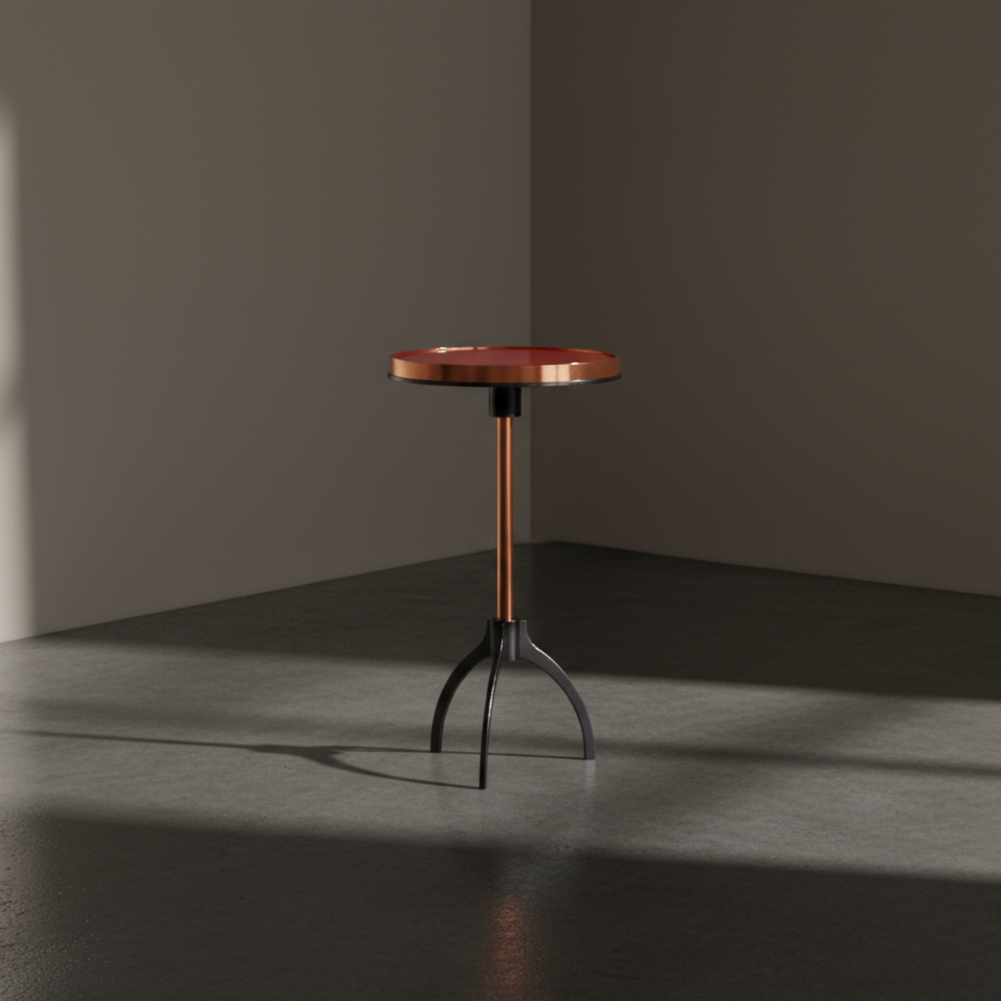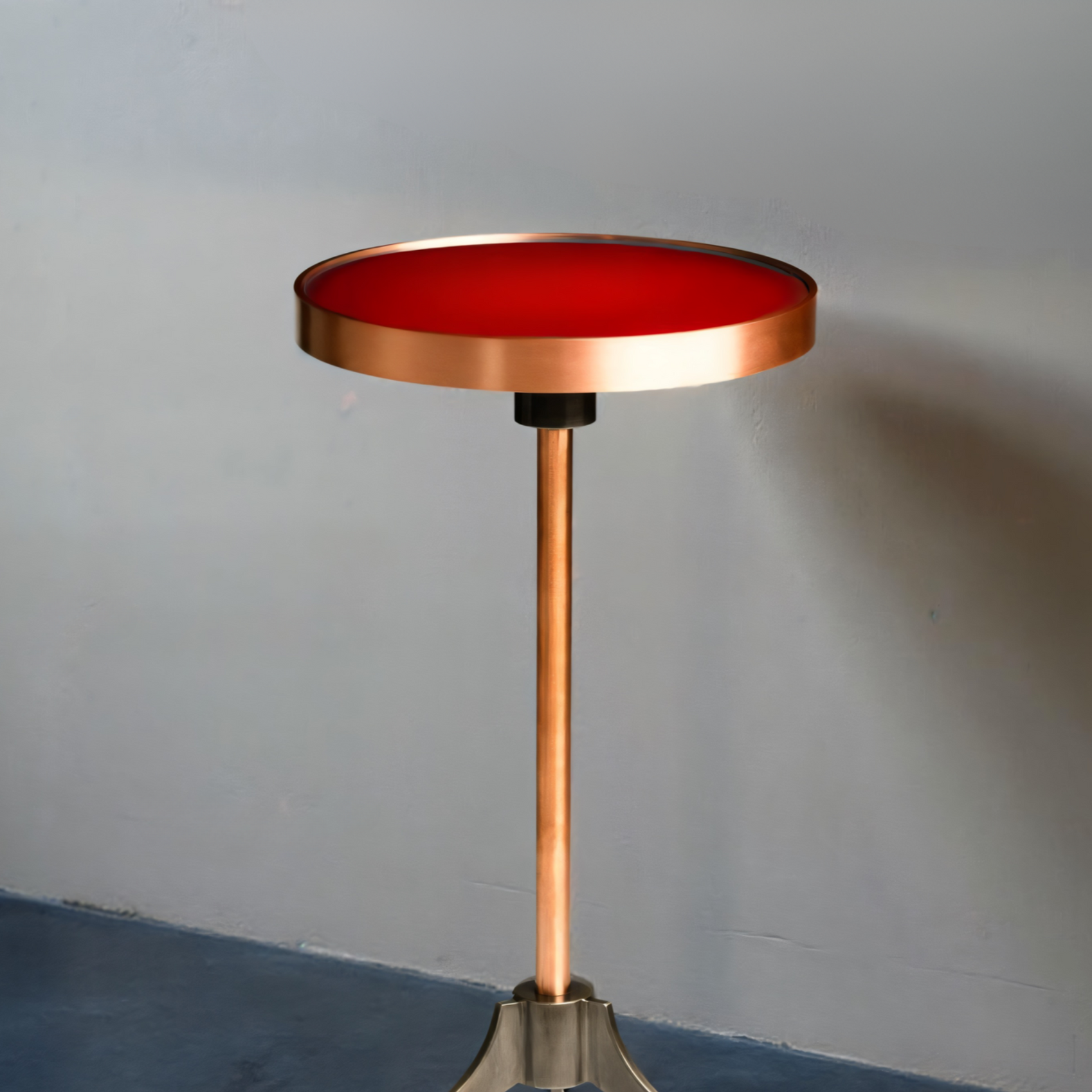 The Bourbon Cocktail Table is a bold union of artistry and function, designed to anchor any space with presence. Its porcelain enamel top is framed in warm, living-finish copper, creating a luminous, durable surface that resists stains and moisture. A solid copper and blued steel base provides both strength and industrial elegance, while every element is meticulously handcrafted to reflect enduring quality and timeless design. Dimensions: 25.5" H x 14" Dia | 30 lbs
